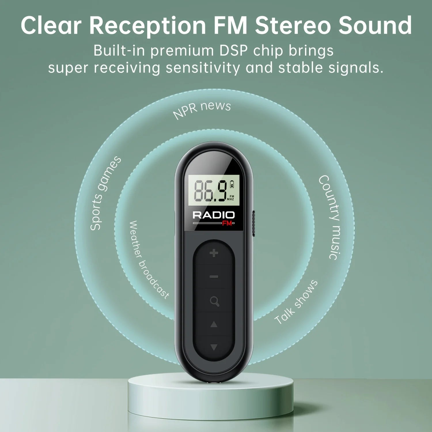 Stay in tune on the go with this Mini Portable FM Radio with Clip and Rechargeable Earphones.